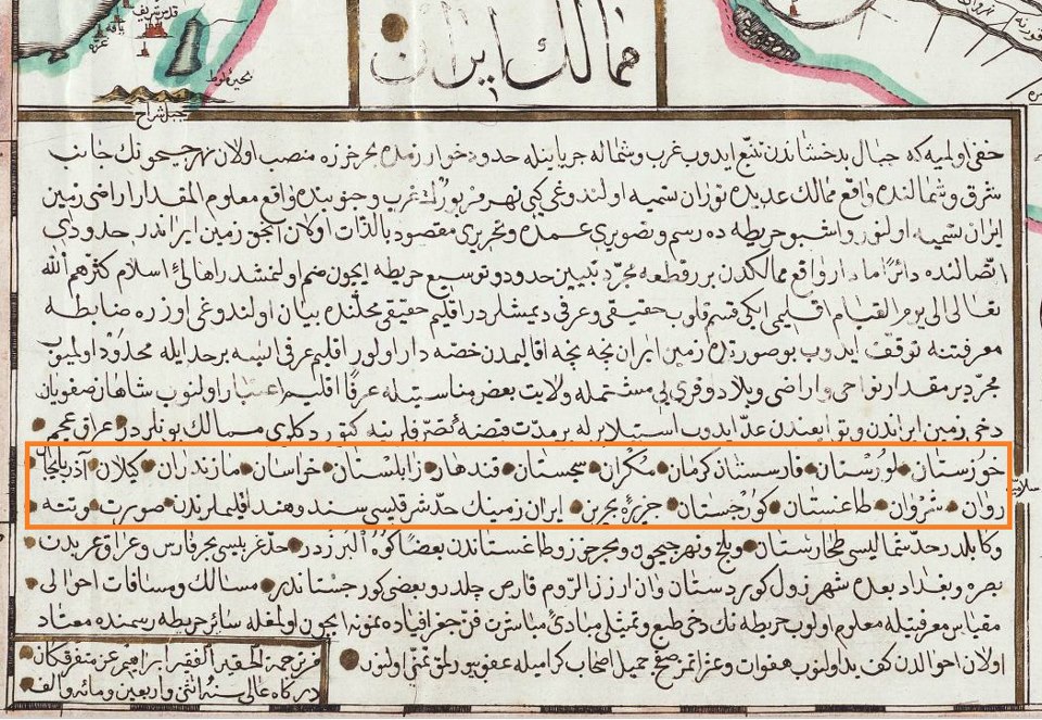 متن گوشه دست چپ پائین نقشه بالا (به ترکی عثمانی) مشتمل بر نام های ولایات ایران