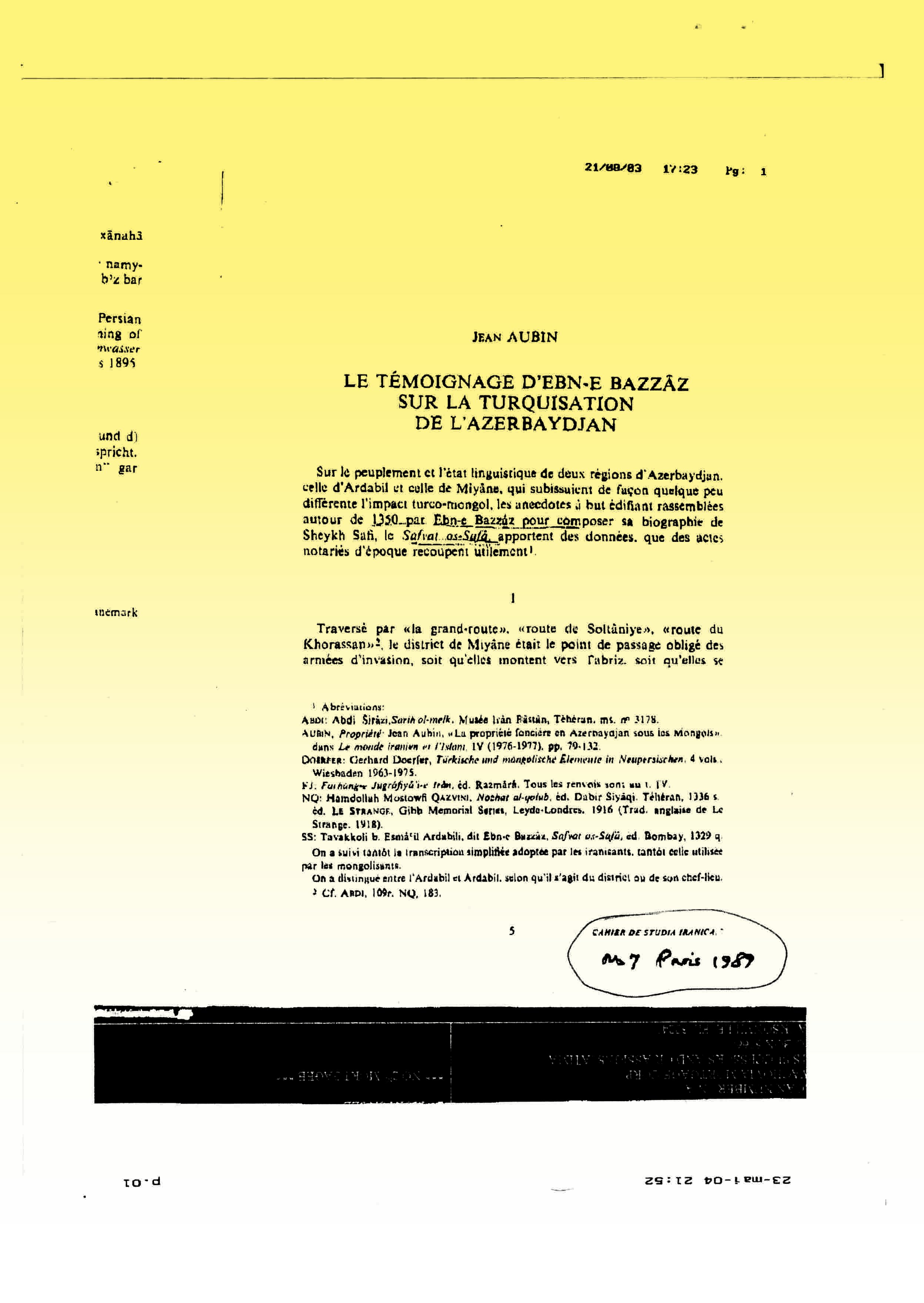 Jean Aubin: Le Temoignage d’Ebn-e Bazzaz sur la Turquisation de l’Azerbaydjan, in Ch.-H. de Fouchécour and Ph. Gignoux, eds., Études Indo-Aryennes offertes à Gilbert Lazard, Paris, 1989