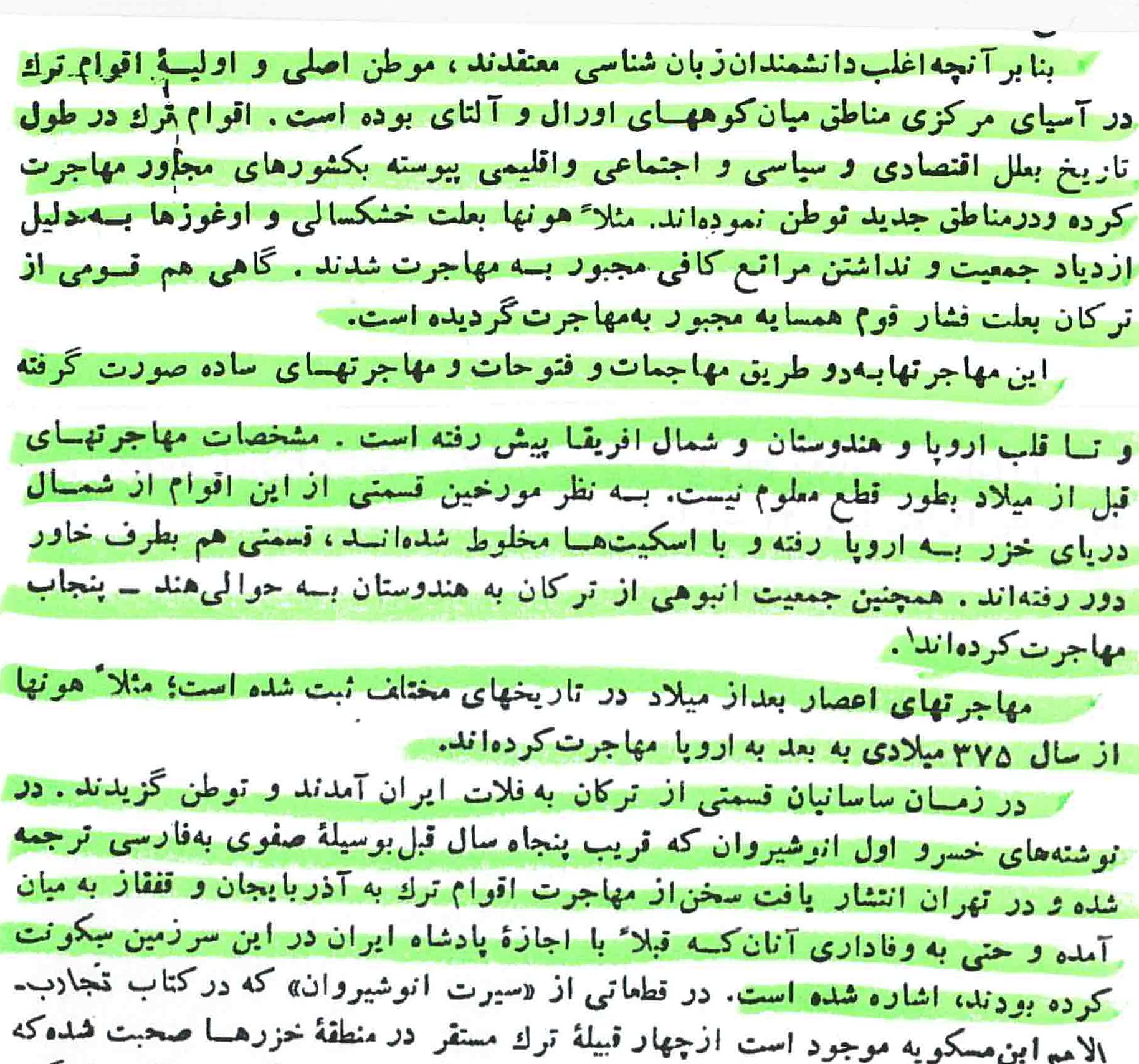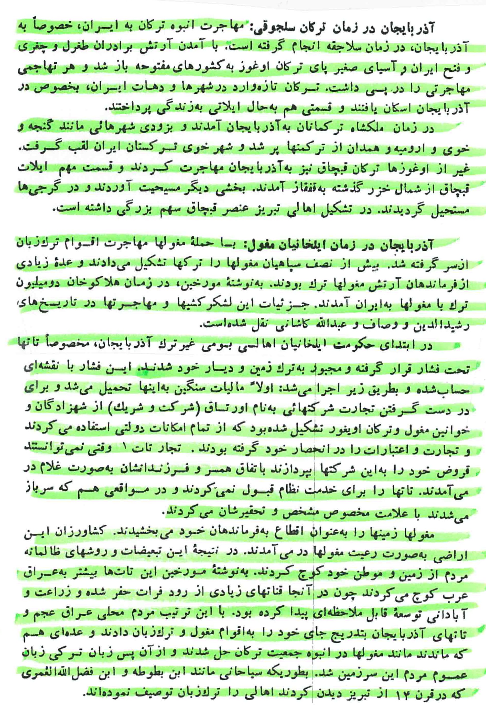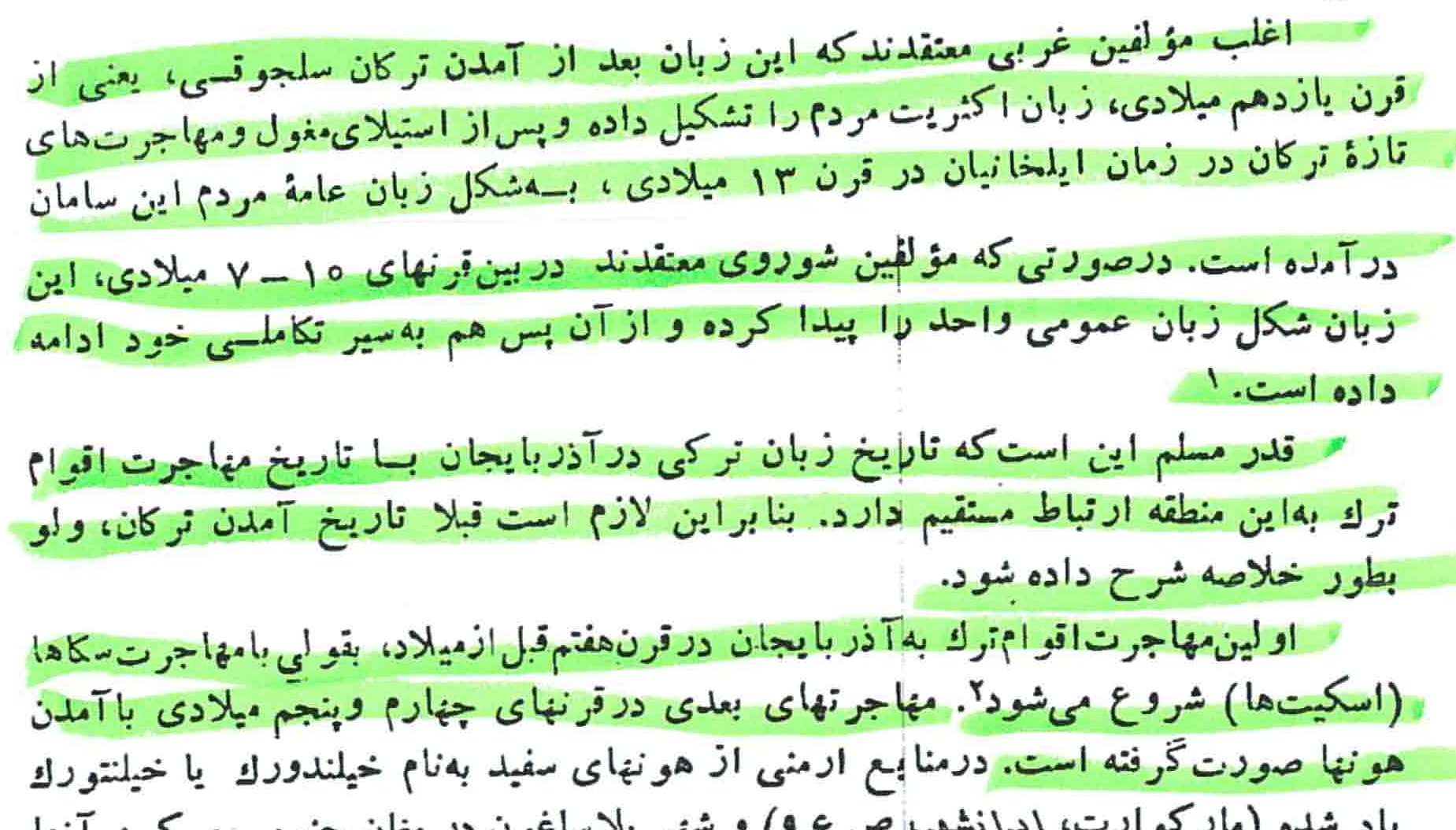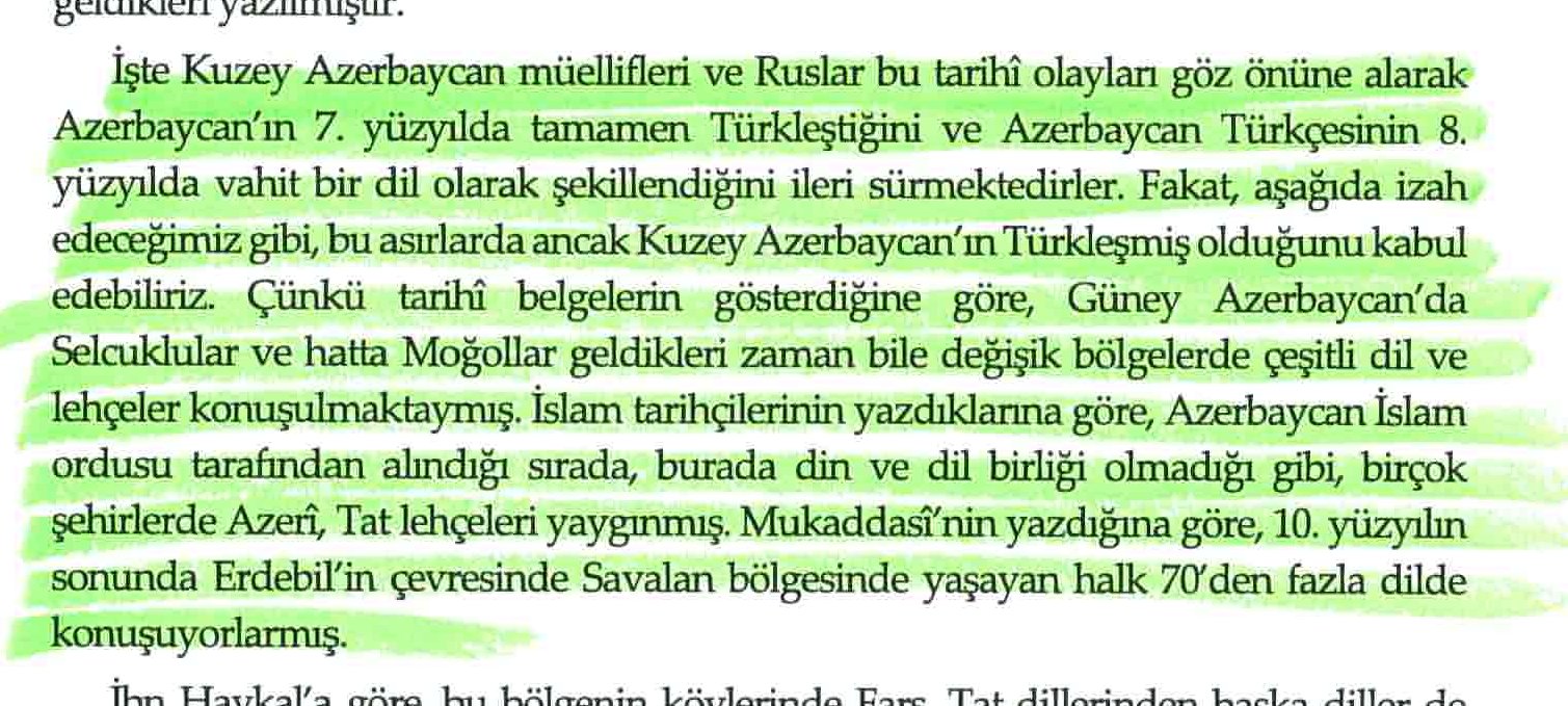 ترجمه: باین ترتیب نویسندگان آذربایجان شمالی و روس با در نظر گرفتن این حوادث تاریخی میگویند که آذربایجان در قرن هفتم میلادی کاملا ترک شده و ترکی آذربایجان در قرن هشتم بصورت زبانی واحد شکل گرفته است. اما طوریکه ذیلا خواهیم دید، میتوان پذیرفت که فقط آذربایجان شمالی در در این سده ها ترک شده است. زیرا طوریکه اسناد تاریخی نشان میدهند، در آذربایجان جنوبی زمانی که سلجوقیان سر رسیدند و حتی زمان مغول ها در مناطق گوناگون زبان و لهجه های مختلف تکلم میشد. بنا به نوشته مورخین اسلامی، هنگامیکه آذربایجان تحت تصرف لشکر اسلام در آمد، در این سرزمین وحدت دین و زبان نبود و در بسیاری شهر ها لهجه های آذری ، تاتی رایج بود. به نوشته مقدسی، مردمی که در اواخر قرن دهم در منطقه دور و بر اردبیل و کوه سبلان میزیستند به بیش از 70 زبان تکلم میکردند.