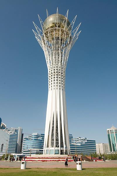 يكى از مكانهاى ديدنى آستانا برجى است بنام «باى تٓرٓك» (به فتح ت و فح ر، باى بمعنى ثروتمند و بلند و تٓرٓك بمعناى درخت تبريزى) كه آدمى را با ٩٧ متر بلندى خود بياد برج ايفل پاريس مياندازد. از بالاى باى ترك ميتوانيد از يكسو «آق اوردا» (قصر سفيد، آق بمعناى سفيد و اوردا بمعنى خانه و كاشانه) يعنى مقر رئيس جمهورى نورسلطان نظربايف را ببينيد كه از سوى بناهاى دولتى، وزارتخانه ها و پارلمان كشور و «بيزنس اورتاليغى» (مركز هاى بيزنس، اورتاليق بمعنى مركز) احاطه شده و با يك بولوار پهناور و طولانى به بناى نوساخت و پر مدعاى «خان شاتير» (خان بمعناى بزرگ و شاتير كه همان چادر است يعنى شاه چادر) وصل شده است. اين چادر فلزى مدرن كه مركز خريد و تفريح است با طرح معمارى خود آدمى را بياد چادر (يورت، به قزاقى «جورت») هاى قبايل كوچنده ترك زبان در دشت هاى آسياى مركزى مياندازد.
