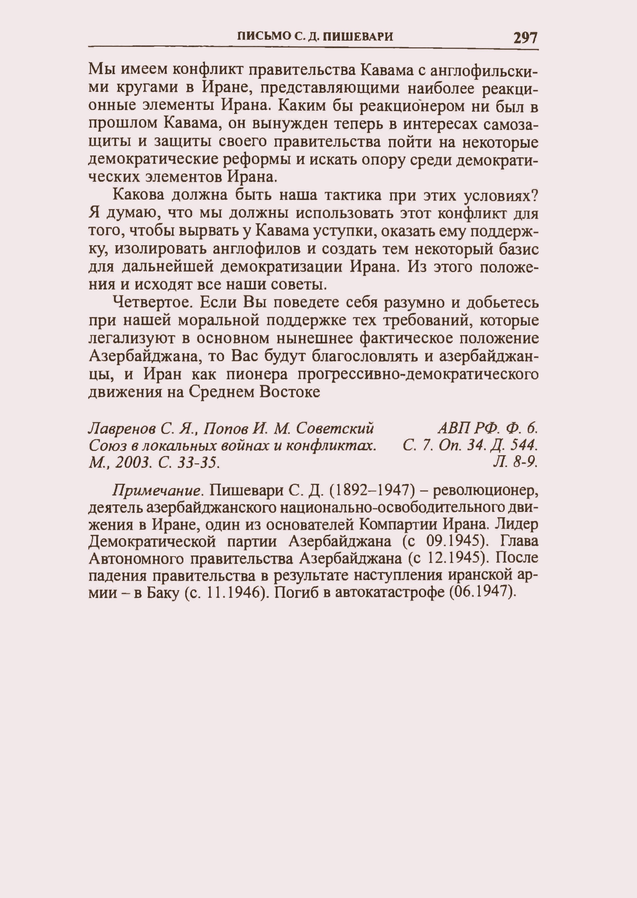 بنده در رابطه با نامه استالین به پیشه وری از دو نفر در مسکو (یکی در انستیتوی تاریخ آکادمی علوم فدراسیون روسیه) و یک نفر در موسسه وودرو ویلسون آمریکا سوال کردم و با یک نفر نشسته روسی و ترجمه انگلیسی مرکز ویلسون و ترجمه فارسی بنده را مقایسه کردیم.