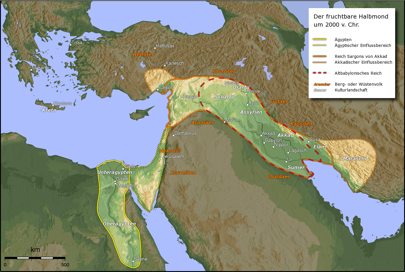 امپراتوری آکاد (اکد) ها (خط منقطع سرخ) و دیگر مناطق هلال حاصلخیز، حدودا 2000 سال قبل از میلاد (پ.م.)، (تهیه کننده در این لینک)