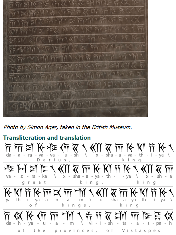 تصویر سنگنوشتۀ داریوش در بیستون (موزۀ بریتانیا) با چهار و در واقع هفت «حرف» نخست نام «داریوش» در زیر: