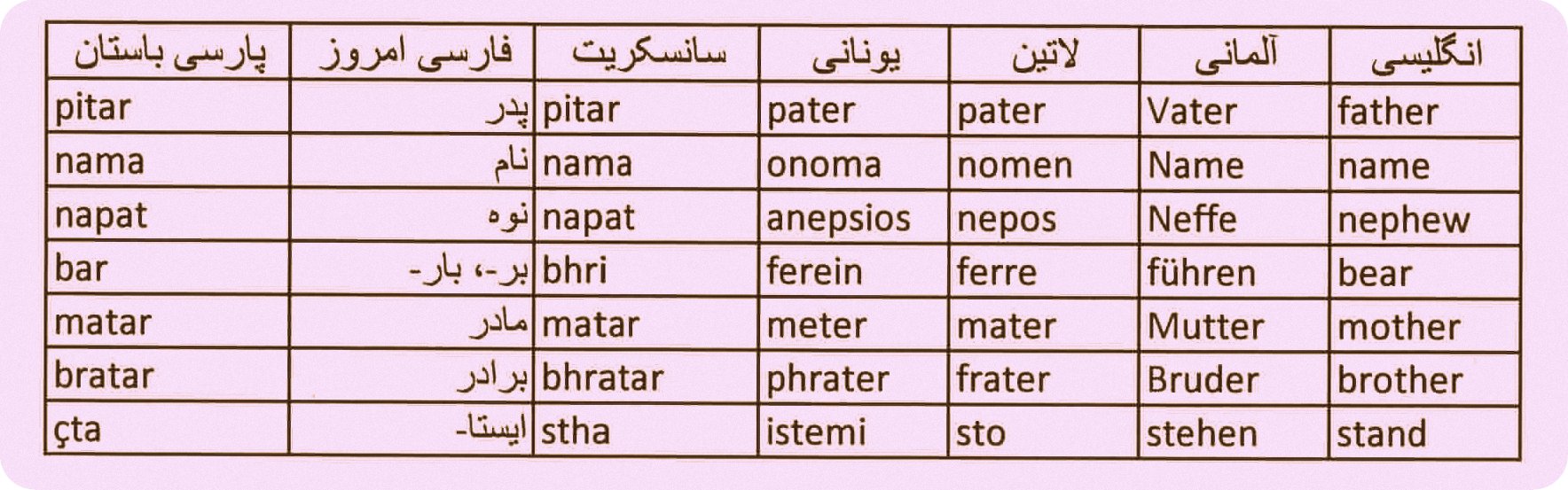 (ج) بعضی نمونه های نزدیکی واژگانی فارسی باستان، سانسکریت، یونانی، لاتین، آلمانی و انگلیسی (21)