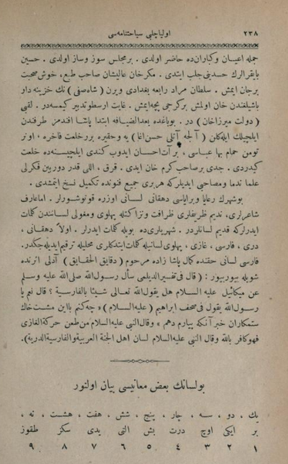 (در همین جا اولیا چلبی در دو صفحه نمونههای واژگان و شعر فارسی را که از مردم شنیده و یا خوانده، ذکر میکند و در ضمن به نقل از مورخ عثمانی کمال پاشازاده فهرستی از واژگان فارسی و ترجمه ترکی آن میدهد که بخشی از آن را در تصویر بالا میبینید. آنگاه چلبی اضافه میکند:) چندین و چند گونه اصطلاحات و عبارات دیگر هم دارند، اما به ذکر همین قدر اکتفا میشود. در دهات دور وبر ما، میان اقوام گوک دولاق (۹) و مغول لهجههای گوناگونی هم وجود دارند که انشاءالله در جای خود شرح داده خواهد شد. ضمنا در این صحرا و نواحی نخجوان قلعههای متین و استوار بسیاری مانند النجاق وان، سران و سوسومارون وجود دارند. جالب است که نام همه قلعههای عجم شبیه نام قلعههای ایروان، شیروان، همدان، نخجوان، وان آذربایجان و اصفهان است. اما نام قلعههای طبرستان مانند بیگ کرمان، چرکز کرمان، یار کرمان و غیرهاست.