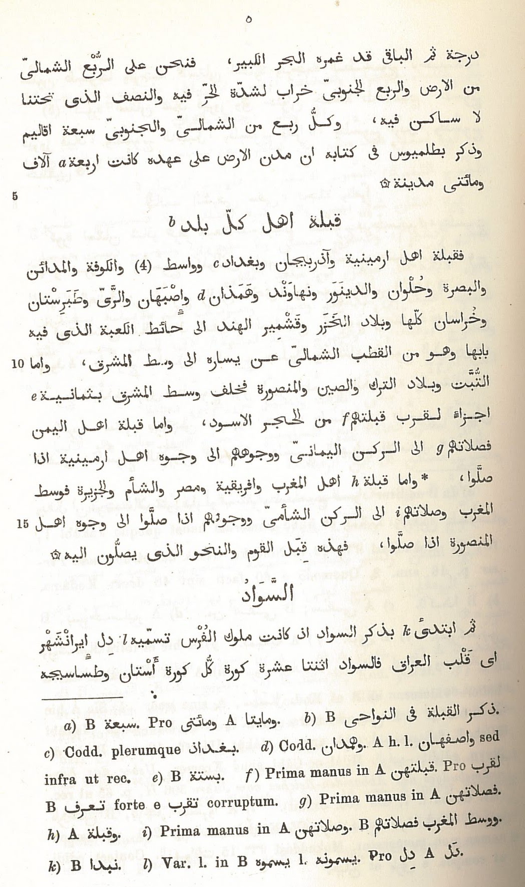 پس قبله مردم ارمینیه (ارمنستان) و آذربیجان (آذربایجان) و بغداد و واسط (میان بصره و کوفه، -ی) و کوفه و مدائن و حلوان و دینور و نهاوند و همدان و اصبهان (اصفهان) و ری و طبرستان و تمام خراسان و سرزمین خزر (7) و کشمیر هند به سوی دیواری که درب کعبه بر آن قرار گرفته، می باشد. آن دیوار از قطب شمال در سمت چپ تا میانه شرق است. و اما قبله مردم تبت و سرزمین ترکان و چین و منصوره (شهری در سرزمین هند، -ی) در میانه مشرق به دلیل نزدیکی قبله آنها (به حجرالاسود) هشت بخش دارد. و اما قبله اهل یمن به سوی رکن یمانی است و رویشان هنگام ادای نماز در مقابل مردم ارمینیه است. و اما قبله مردم مغرب و آفریقا و مصر و شام و جزیره در وسط مغرب قرار دارد و نمازشان به سمت رکن شامی است و رویشان به هنگام نماز در مقابل نمازگزاران منصوره است.