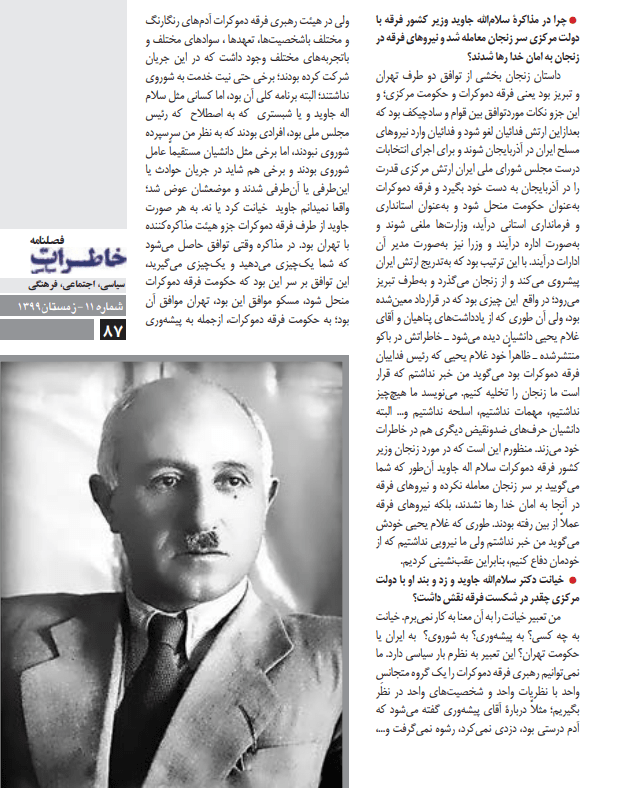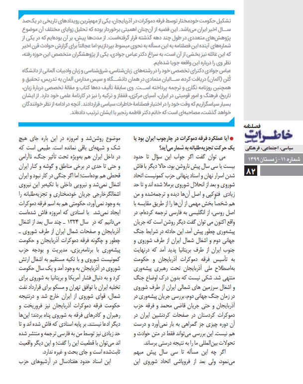 مصاحبه «فصلنامه خاطرات سیاسی» چاپ تهران (سال سوم، شماره 11، زمستان 1399) با عباس جوادی در باره حکومت یکساله «فرقه دمکرات آذربایجان» به رهبری پیشه وری، شماره ویژه فصلنامه تحت عنوان «یک سده تکاپوی جامعه مدنی» در باره مهم ترین تحولات ایران در سده چهاردهم خورشیدی، «قرنی سهمگین از اسفند 1299 تا اسفند 1399»، ص. 82-90.