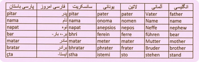 *** بعضی نمونه های نزدیکی واژگانی فارسی باستان، سانسکریت، یونانی، لاتین، آلمانی و انگلیسی: