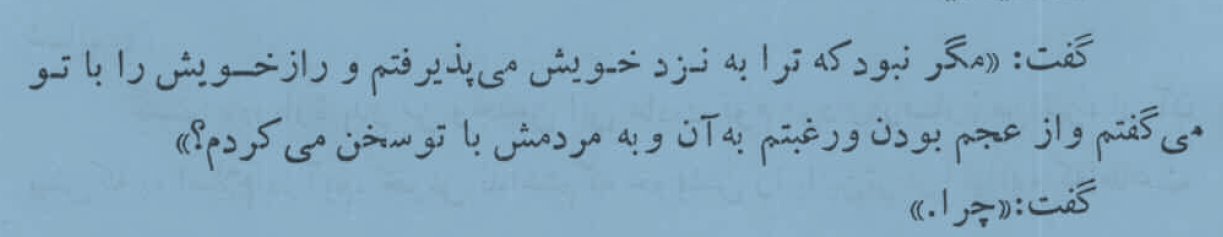 «مگر نبود که ترا به پیش خویش می پذیرفتم و راز خویش را با تو میگفتم و از عجم بودن و رغبتم به آن و به مردمش با تو سخن میکردم؟»