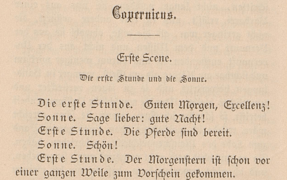 لوئیجی کاوالی-اسفورزا، ژنتیک شناس معروف بین المللی، در مقدمه یکی از کتابهایش در باره نمایشنامه «کُپرنیک» اثر نویسنده سرشناس ایتالیائی «لئوپاردی» صحبت میکند. شخصیت های اصلی داستان عبارت هستند از: خورشید، «ساعت نخست روز» و کپرنیک.[1] در صحنه اول، خورشید به ساعت نخست شکایت میکند و میگوید که دیگر از گردش دور زمین خسته شده و باید از زمین خواست که پس از این او کمی از این بار را بر دوش بگیرد و خودش دور خورشید بچرخد. ساعت نخست با سراسیمگی و نگرانی میخواهد خورشید را از این نقشه اش باز دارد، زیرا فکر میکند اگر اوضاع عوض شود و به جای آنکه خورشید دور زمین بگردد، زمین دور خورشید بچرخد، همه نظام هستی به هم میخورد و سنگ روی سنگ باقی نمی ماند. اما خورشید از نظرش دست بردار نیست و میگوید اگر به فیلسوف های هوادار زمین گفته شود، آنها همه را قانع خواهند کرد که این تغییر کار درستی است، چرا که آنها قادرند هر چیز را که بخواهند، چه خوب و چه بد، به دیگران بقبولانند. صحنه دوم نمایشنامه نشان میدهد که خورشید به خواست خود عمل کرده و دیگر دور زمین نمی چرخد. کپرنیک که شدیدا از بر نیامدن خورشید دچار واهمه و نگرانی شده، همراه با ساعت نخست پیش خورشید میرود، تا ببینند او چه میگوید. خورشید میگوید زمین باید از ادعای خود مبنی بر اینکه مرکز کیهان است، دست بردارد و دور او بچرخد. کپرنیک میگوید حتی برای فیلسوف ها هم قانع کردن زمین به این تغییر بنیادین مشکل خواهد بود. زمین و ساکنان آن به این باور عادت کرده اند که آنها مرکز هستی و کیهان هستند و همین باور در آنان غرور و تکبُر یک امپراتور را به وجود آورده است. تغییری چنین سهمگین عواقبی به همان درجه سهمگین به بار خواهد آورد، چه فیزیکی و چه اجتماعی و فلسفی. تمام تصورات و پیش فرض ها در باره زندگی بشر زیر و رو خواهد شد. اما خورشید اصرار میکند و میگوید که بعد از این تغییر نیز زندگی به روال سابق ادامه خواهد یافت، همه پادشاهان و امیران همچنان به اهمیت و برتری خود باور خواهند داشت و قدرت آنان کوچکترین خللی نخواهد دید. کپرنیک ایرادهای دیگری نیز می گیرد و میگوید: در آن صورت ممکن است یک انقلاب کهکشانی صورت گیرد، ممکن است سیاره های دیگر نیز سر بلند کنند و مدعی شوند که آنها هم حق دارند مانند زمین خود را مرکز هستی بپندارند. حتی ممکن است ستارگان نیز دست به اعتراض بزنند. در نهایت ممکن است خورشید اهمیت خود را از دست بدهد و برای خود مدار دیگری را انتخاب کند. اما خورشید همچنان پافشاری میکند که دیگر میخواهد استراحت کند و از چرخیدن دور زمین دست بردارد. خورشید در پایان برای رفع واهمه کپرنیک از سوزانده شدن با اتهام کُفر و الحاد میگوید اگر او کتابی در این باره بنویسد و آن کتاب را به پاپ واتیکان تقدیم نماید، از چنین سرنوشت محتومی جان به در خواهد برد.