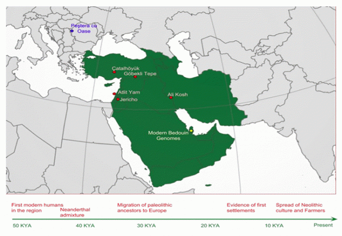 آنچه که بر اساس یافته های باستانشناختی به یقین میدانیم این است که «انسان نما»های مختلف و نئاندرتال ها پیش از تکامل انسان هوشمند نیز دستکم از 1.5 میلیون سال پیش، از آفریقا به مناطق مختلف آسیای غربی مهاجرت کرده اند. اما اطلاعات ما در باره تاریخ دقیق این مهاجرت و نوع این انسان نما ها و نئاندرتال ها دقیق نیست. به احتمال قوی بین این انسان نما ها و انسان های مدرنی که به تدریج به آسیای غربی مهاجرت کرده اند، آمیزش هایی رخ داده است. از این نقطه نظر، دانشمندان بیولوژی و ژنتیک در یافته های ژنومیک این انسان های دوره «گذار» پیگیر این پرسش ها بوده اند. از این بررسی ها مشخص شده است که انسان های کنونی این منطقه در نتیجه اختلاط های 60 هزار سال پیش، میانگینی عبارت از 1-4 در صد ژن انسان های نئاندرتال را دارا هستند.