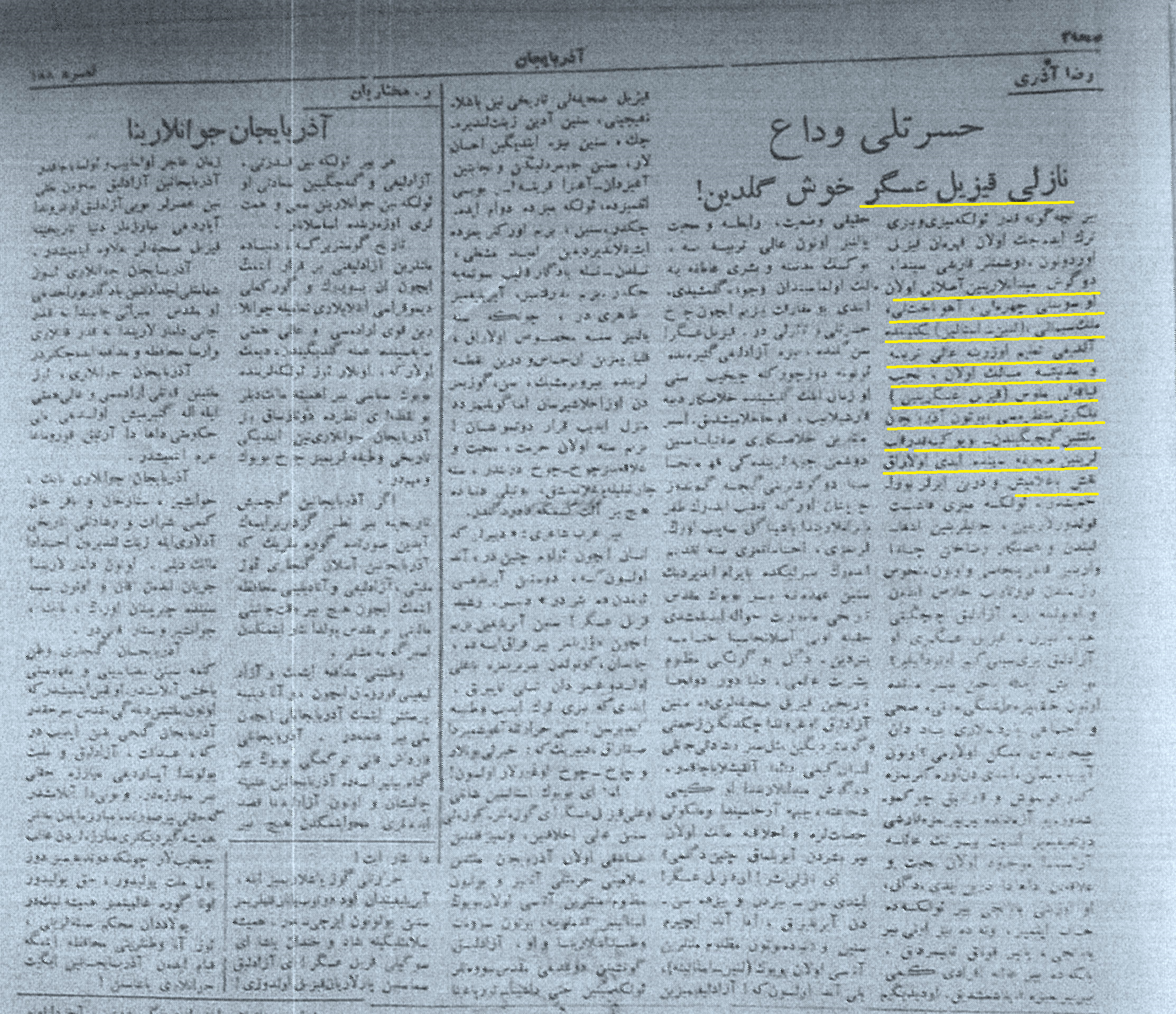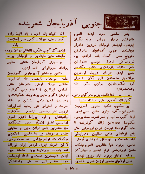 (ترجمه: ما ملت آذری هستیم، نامی پاک و خونی پاک داریم/هزار شیرمرد مانند کوراوغلی و جوانشیر داریم/حالا سرزمینی که بابک و ایلخان (!) را زاده، تبدیل به گلستان شده است/و در زیر سایهٔ تو (استالین) این سرزمین بزرگ زندگی آسودهای دارد/در این عالم زنده و پایدار باشی، ای رهبر محبوب — با عدل خود عالم را نورافشان کردی).