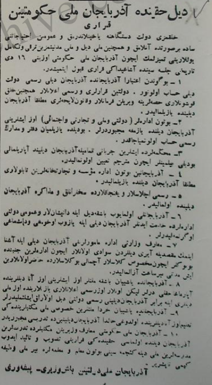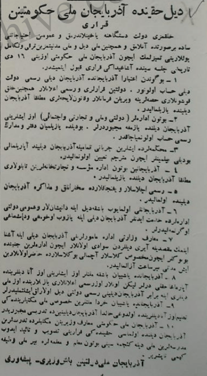 1. از امروز به بعد زبان آذربایجانی در آذربایجان زبان رسمی و دولتی محسوب می شود. قرارهای دولت، اعلان های رسمی و همچنین قرارهای صادره در حصه های قشون خلقی و لایحه های قانون مطلقا باید به زبان آذربایجانی باشند.